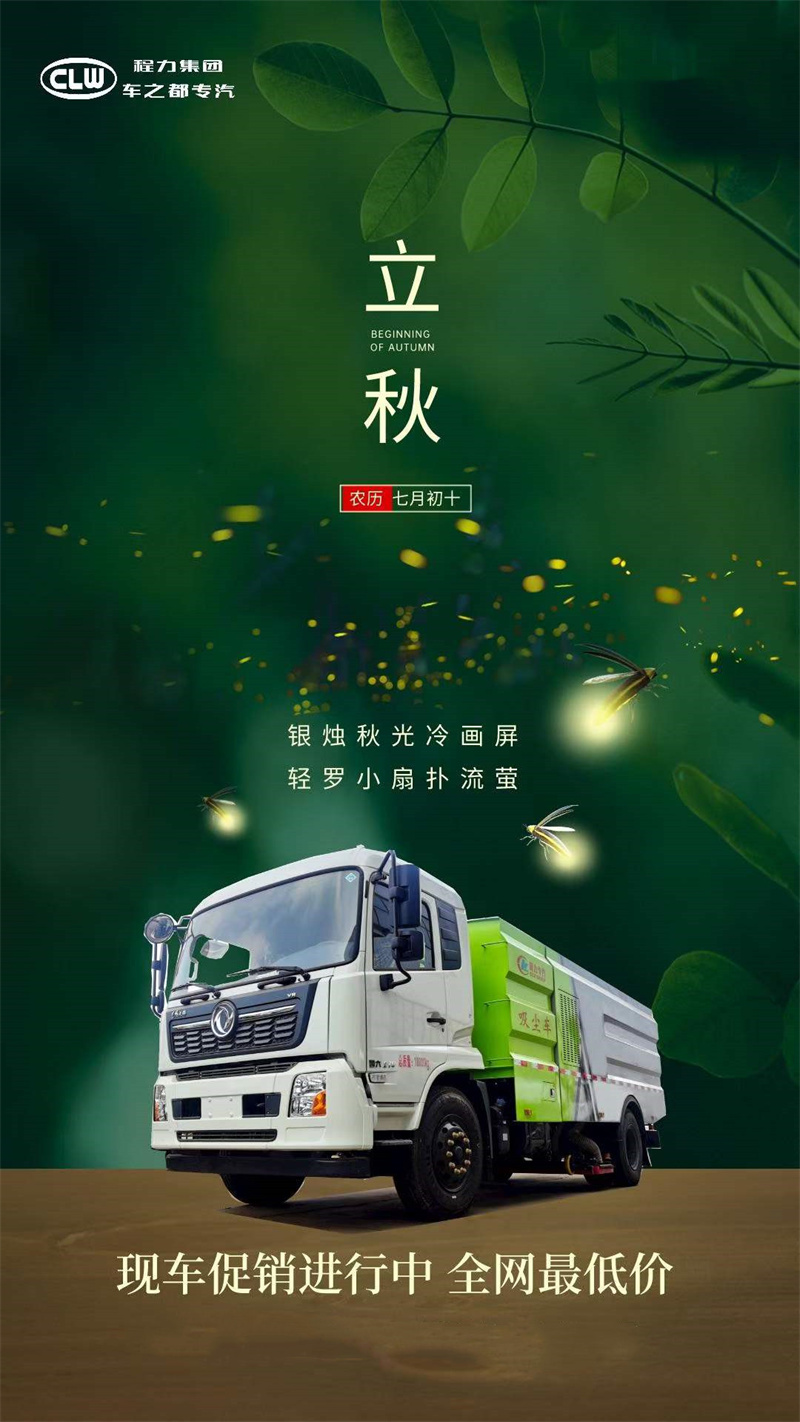 立秋了,程力集團環衛車廠家希望秋天的風,可以吹走夏日所有的遺憾,希望這個秋天,可以帶來很多好消息,所有的努力都有好的結果,所有的付出都有好的收獲。程力汽車環衛車促銷進行中,全網最低價。