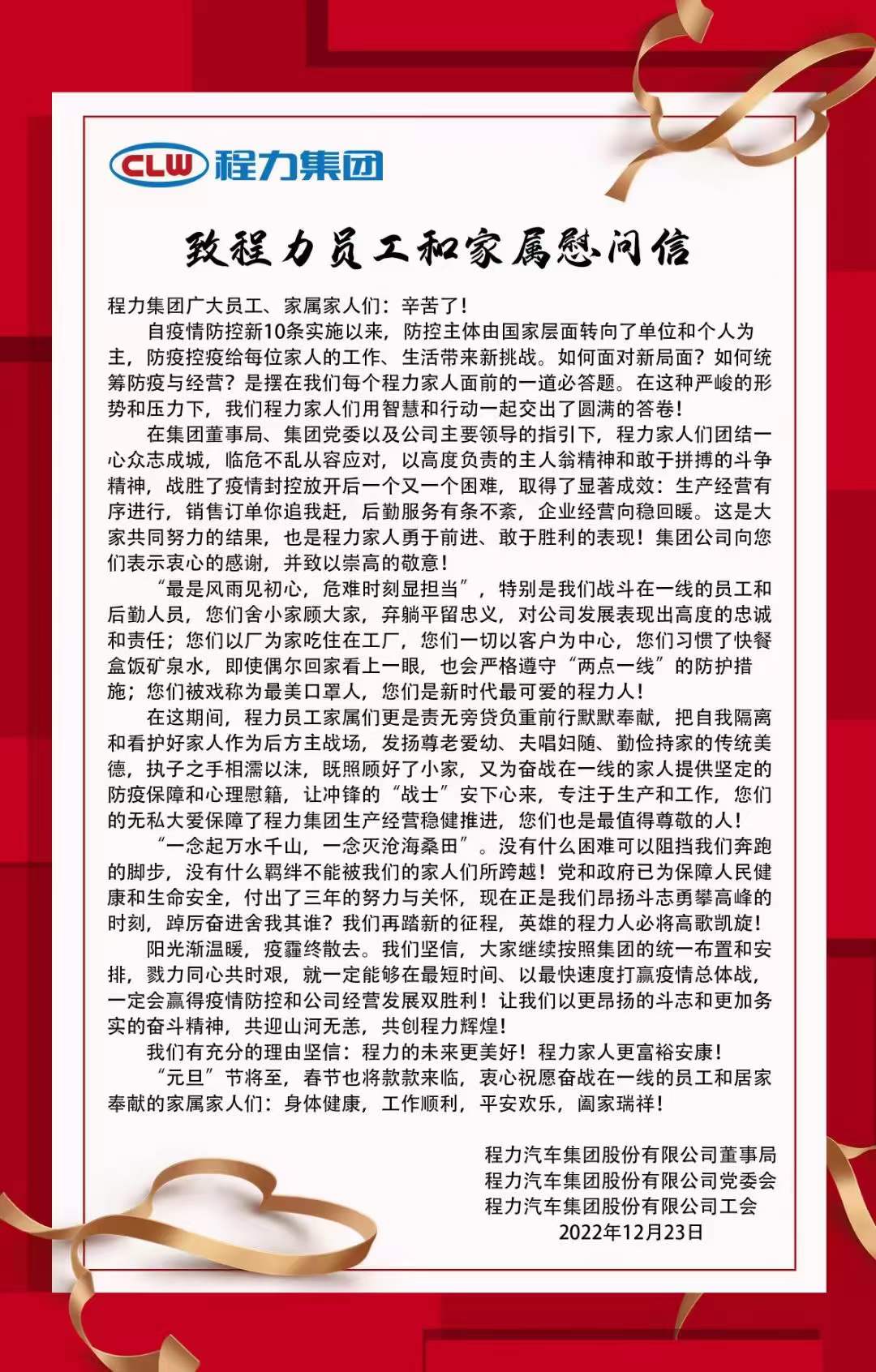 致程力員工和家屬慰問信,程力集團廣大員工以及家屬家人們,辛苦了!”元旦“節將至,春節也將款款來臨,衷心祝愿奮戰在一線的員工和家屬家人們:身體健康,工作順利,平安歡樂,阇家瑞祥!程力24小時服務熱線4006009760為您竭誠服務!