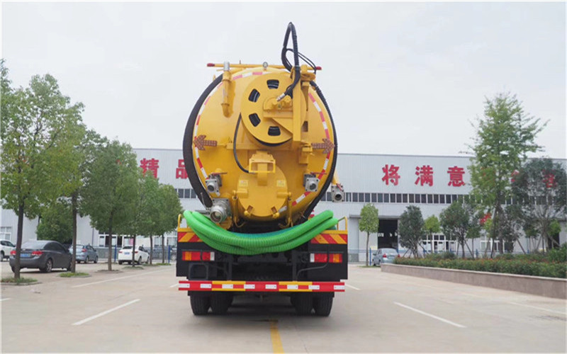 這款車的上裝配置了碳鋼板材,其中罐體前段為清水罐約4方,后段為污水罐,兩倉(cāng)球閥互通。罐體尺寸為4700mm×1800mm。兩倉(cāng)中間用封頭,通潔250流量高壓清洗泵,配60米高壓管。安裝山東美卓30方水環(huán)泵帶375馬力新副發(fā)。卷盤裝后封頭180度旋轉(zhuǎn),后封頭液壓打開。后封頭上一個(gè)500水泥蓋放污,可液壓開啟,側(cè)面一個(gè)6寸強(qiáng)排閥,后封頭一個(gè)6寸出口,一個(gè)6寸進(jìn)口,罐內(nèi)半鋪不銹鋼,防溢流報(bào)警器,駕駛室頂部警燈,罐體尾部箭頭燈,油水分離器,帶一個(gè)視污窗口和帶8米吸污管。