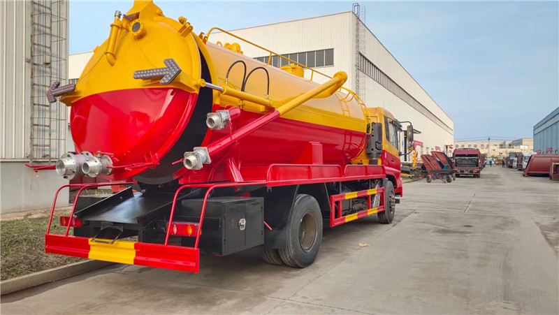東風天錦VR清洗吸污車的上裝罐體結構屬于水箱邊掛式,中間為圓柱形污罐,兩邊是方形水罐,水罐和污罐可同時液壓舉升,卸污快速方便。污水罐尾部安裝有直徑19毫米的水管卷盤,一般標配的是60米長水管,方便沖洗車身及罐體內部,在車輛左后部下方還配有備用水管卷盤。罐體后蓋可液壓打開,后蓋周圍有四個鎖緊裝置,可保證罐體有效密封。