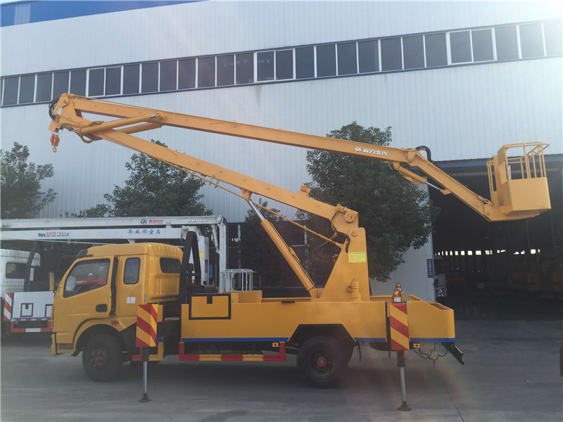 東風雙排高空作業車底盤配置東風多利卡雙排駕駛室,2800 軸距,7.00 鋼絲胎,油剎,五檔箱, 前橋 2 噸,后橋3.5 噸,帶方向助力,帶空調,原廠 ABS。這款高空作業車采用液壓360度全回轉,三節折疊臂,單液壓舉升缸,帶雙向平衡閥,帶電控操作舉升臂,四支液壓油缸可調式支腿帶雙向液壓鎖(支腿操作為手動操作,可單獨控制),上下二套操作臺,帶1噸吊鉤,作業高度13米,作業半徑 5.6米。