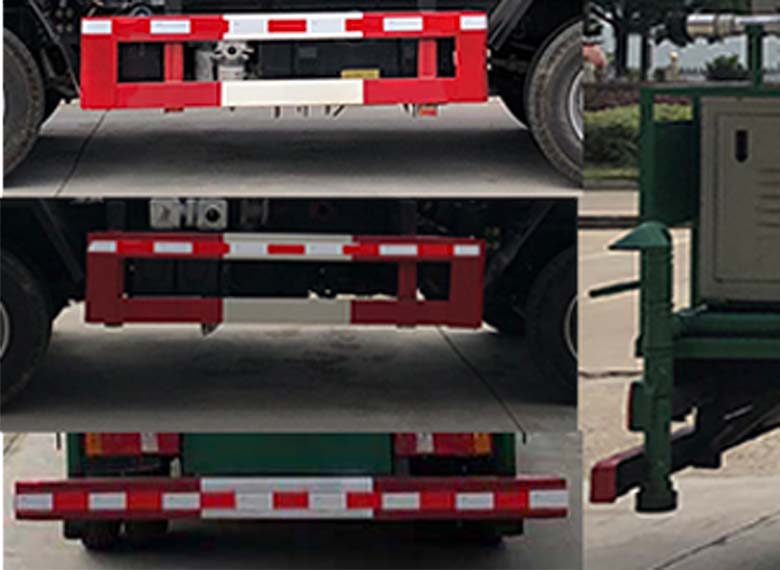 隨底盤選裝駕駛室.側防護及后下部防護裝置均采用Q235材質,均采用焊接連接,后下部防護尺寸:55×100(mm),離地面高度330mm;ABS型號:CM4YK,ABS生產企業:廣州瑞立科密汽車電子股份有限公司.專用裝置為抑塵霧炮,用于礦場,露天堆場及爆破現場等的噴霧抑塵..選裝駕駛室外形樣式.選裝后部平臺裝置,4.整車長度與軸距和后懸對應關系:5330/2600/1630,5680/2800/1780.