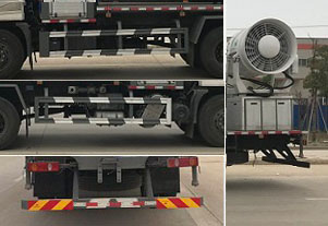 專用裝置為抑塵霧炮,用于城市抑塵.整車長/軸距/后懸對應(yīng)關(guān)系為(mm):9260/5100/2720;8860/4700/2720;8860/4500/2920;8260/4200/2620;7860/3950/2470;防護(hù)材料:Q235A碳鋼,連接方式:左右側(cè)面采用焊接連接,后下部防護(hù)采用螺栓連接,后部防護(hù)斷面尺寸(mm):120×50,后部防護(hù)離地高度(mm):490.ABS,型號/生產(chǎn)廠家:3631010-C2000/東科克諾爾商用車制動系統(tǒng)(十堰)有限公司,ABS-E 4S/4M/生產(chǎn)廠為威伯科汽車控制系統(tǒng)(中國)有限公司。選裝霧炮型號:WF-60/WF-80/WF-100所對應(yīng)的整備質(zhì)量分別為:9550kg/10500kg/11200kg。隨底盤選裝駕駛室。