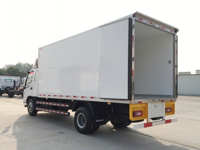車廂頂部封閉,不可開啟.選裝導流罩,選裝單排帶臥鋪.選裝ABS,ABS型號44600XXXX0,廠家:威伯科汽車控制系統(中國)有限公司.選裝單雙側開門,側開門可取消.選裝液壓尾板. 選裝大輪罩.選裝同等功率制冷機組,防護的材料是冷板B-2.0/20,側防護與貨箱橫梁螺栓連接.后防護與車架縱梁螺栓連接,斷面尺寸為100mm×50mm,后防護離地高度460mm.