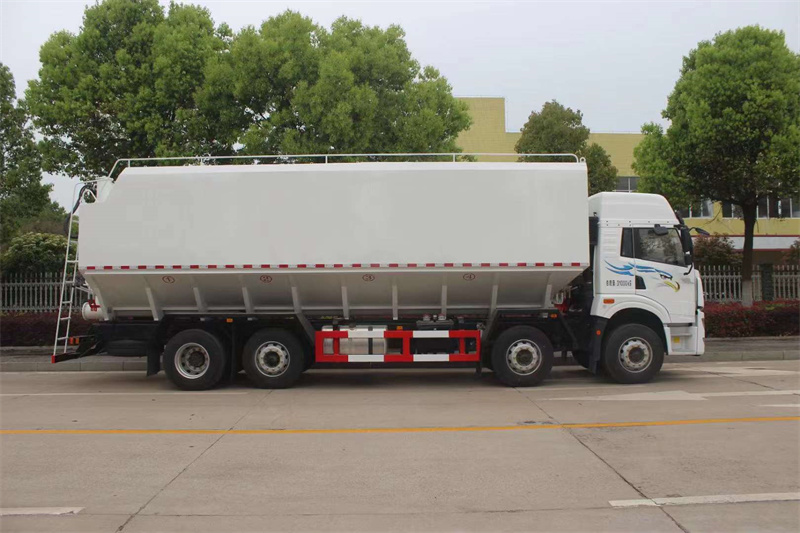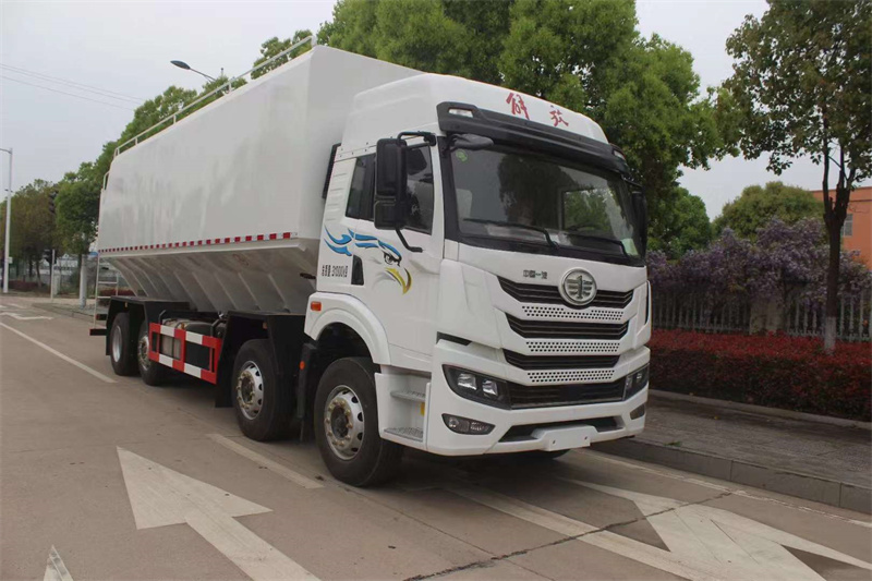 解放悍V前四后六國六散裝飼料運輸車, 悍V平地板高頂全浮駕駛室(四點空氣懸置),可選大柴320馬力(CA6DK1-32E6)或錫柴290馬力國六柴油發動機,一汽CA10TAX130M(半鋁殼),457升級沖焊橋(速比4.444),295/80R22.5-16層級.