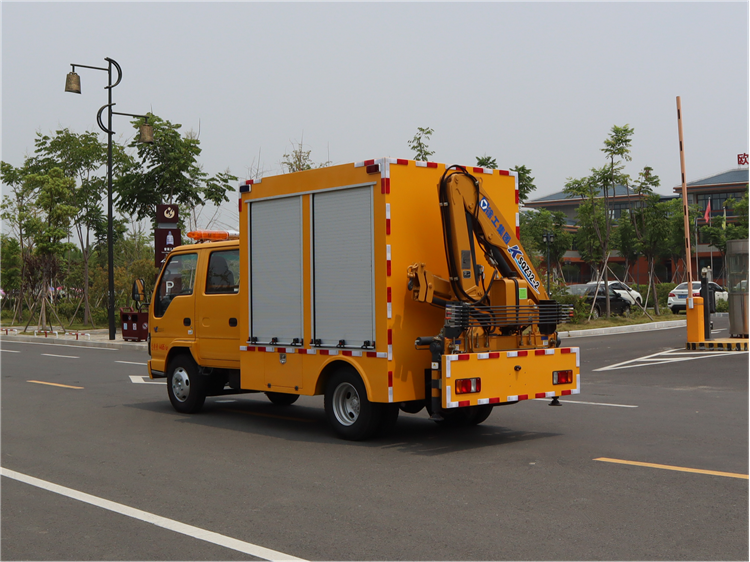 慶鈴五十鈴搶險救援車輛尾部安裝2噸徐工折臂吊機,最大額定起重質量:2000Kg,救援車輛兩側都可操作吊機工作。帶2個液壓支腿。救援車駕駛室頂帶工程黃工程燈,可選安裝場外照明燈,可升降。救援車廂頂可選安裝升降照明燈,可選升降8米-12米。救援車廂兩側帶2個卷簾門。內含發電機組、電控箱、排水系統等各類應急設備。駕駛室帶方向助力、冷暖空調機倒車影像。