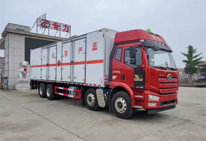 解放8*4危險品廂式車配置為: 道儀茨大柴320馬力發動機,10檔變速箱, 解放獨有氣驅尿素系統,無電泵,耐造抗用不易堵,解放危險品運輸車廂體故障率降低90%行業唯一,最新法規。