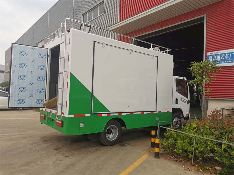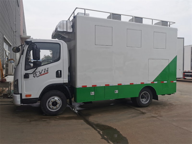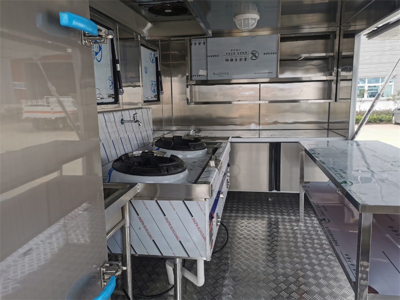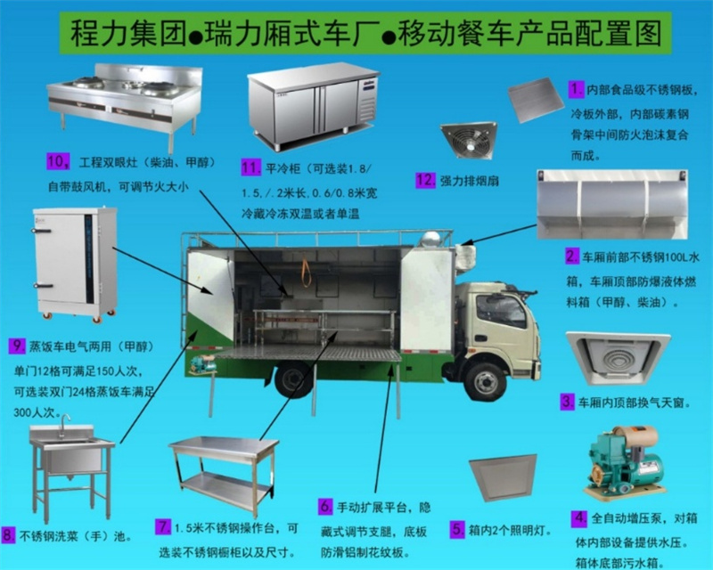 餐車箱體外冷板,內不銹鋼板,5cm復合保溫板,底板防滑花紋鋁板,廂體帶不銹鋼凈水箱、洗手池、污水箱、燃料箱、不銹鋼爬梯護欄,加裝雙眼灶、平冷柜、蒸飯車、不銹鋼菜架等。
