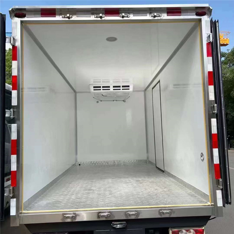 冷藏車3.7米專用底盤:前后無穩定桿、右置油箱、鋼制輪輞、6.25mm輪幅、四輻,多功能方向盤、電動助力轉向、普通真空助力器、織物座椅(普通)、靠背分體式、手動調節,電加熱除霜外后視鏡、電動門窗升降、中控鎖、遙控門鎖、 導流罩、冷暖一體,電動空調、有定速巡航、有倒車雷達(無主機)、有自動大燈、1495/1420、鋼制側防護、有反射器型反光標識、鋼制輪輞、有車身防盜、有發動機前隔熱墊、3.5吋點陣屏儀表、320Nm、L185R15-8PR-QH、MP3+藍牙功能、鹵素大燈、有一鍵鎖車升窗(無防夾)ABS。