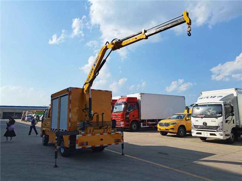 搶險救援車廂體前部為發電機艙,設備左右配置消防鋁合金卷簾門,后部卷簾門結構,艙板鋁花紋,廂體電泳漆,防蝕銹能力強,配備30千瓦發電機,備電箱,徐工2噸二節折臂吊。