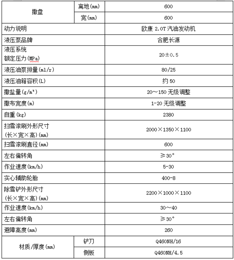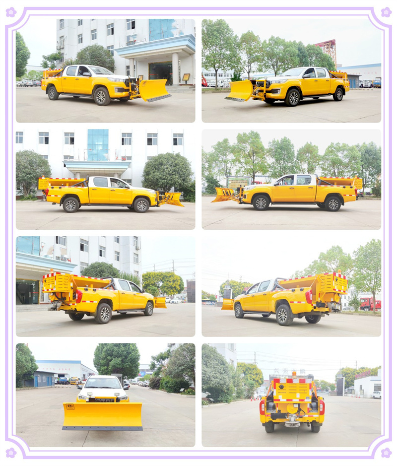 該皮卡除雪車適用于現(xiàn)代城市、高速等路段除雪、融雪、掃雪及破冰的專業(yè)化運(yùn)輸與作業(yè)車輛,該車前置除雪鏟、掃雪滾刷互換使用,積雪厚時(shí)用掃刷將其掃至馬路兩側(cè),或用推鏟把結(jié)冰的積雪推至馬路兩側(cè)。后置融雪撒布機(jī),除雪的過程中,撒布機(jī)拋灑融雪劑,防止?jié)窕穆访娼Y(jié)冰影響交通,使車輛安全通過。