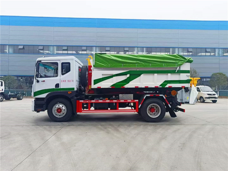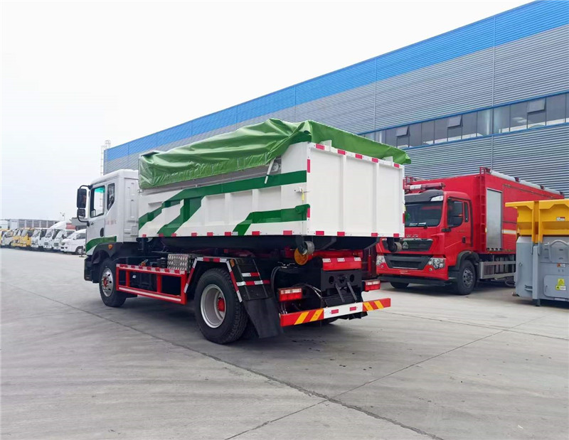 程力汽車研發(fā)的新款東風D9建筑勾臂垃圾車帶電動雨篷。工地專用建筑垃圾車。
